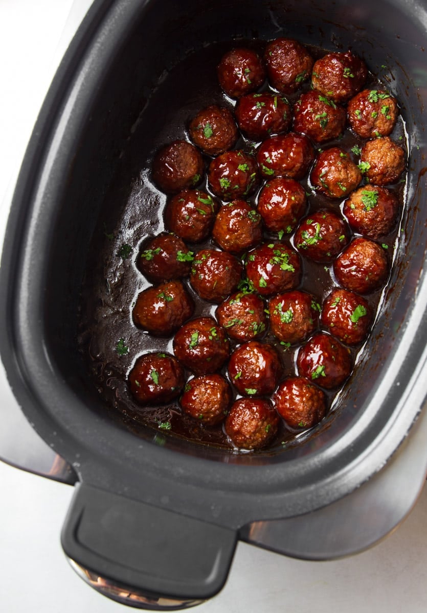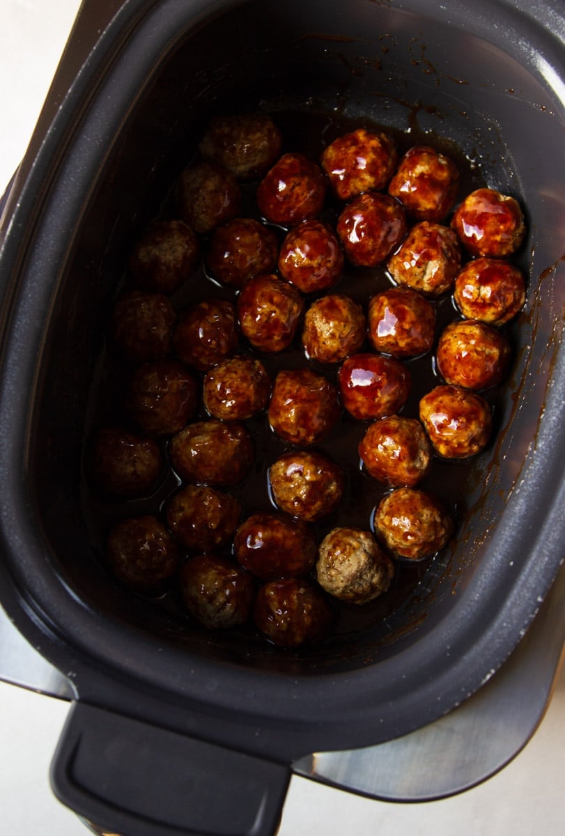 - Cover and cook on LOW for 3–4 hours or HIGH for 1½–2 hours, stirring once halfway through so every meatball gets coated in the glossy bourbon glaze.