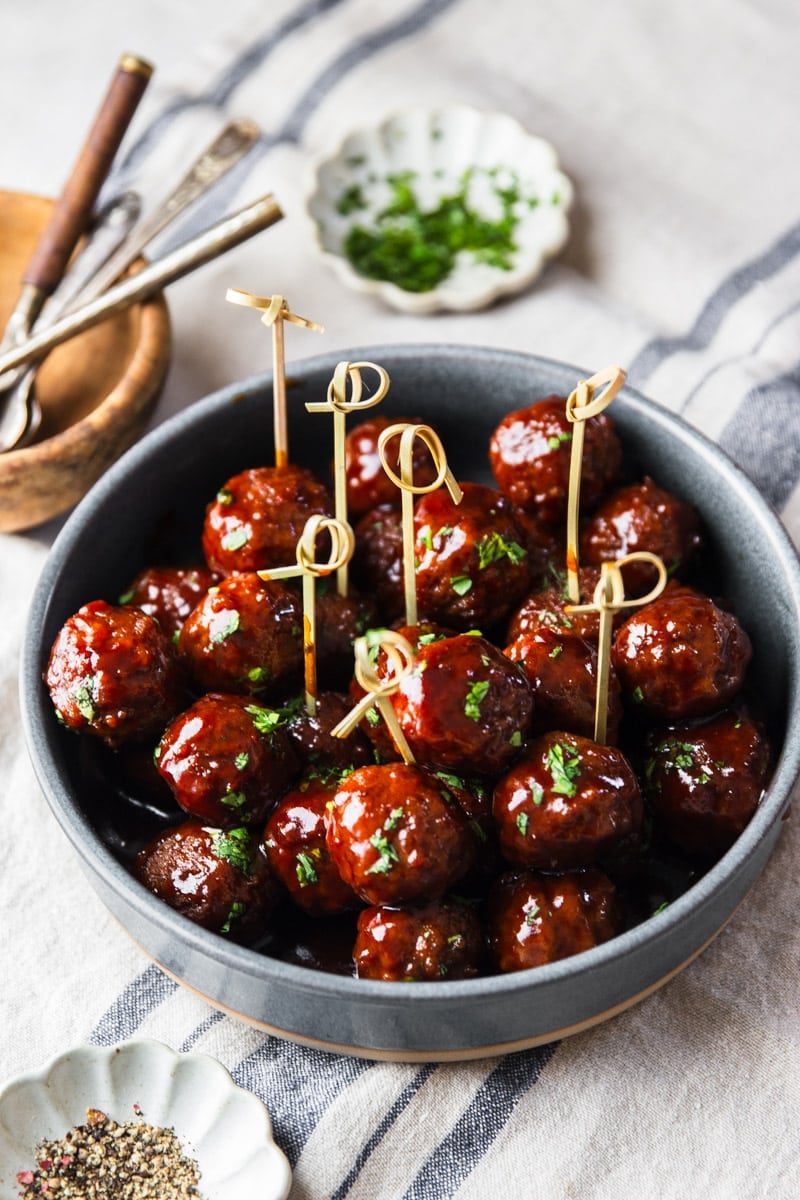 👉🏻 Season the meatballs only after the glaze is set, I also made this mistake and my test batch of party meatballs turned out super salty. Once the sauce is set, taste it and season with salt and pepper accordingly.