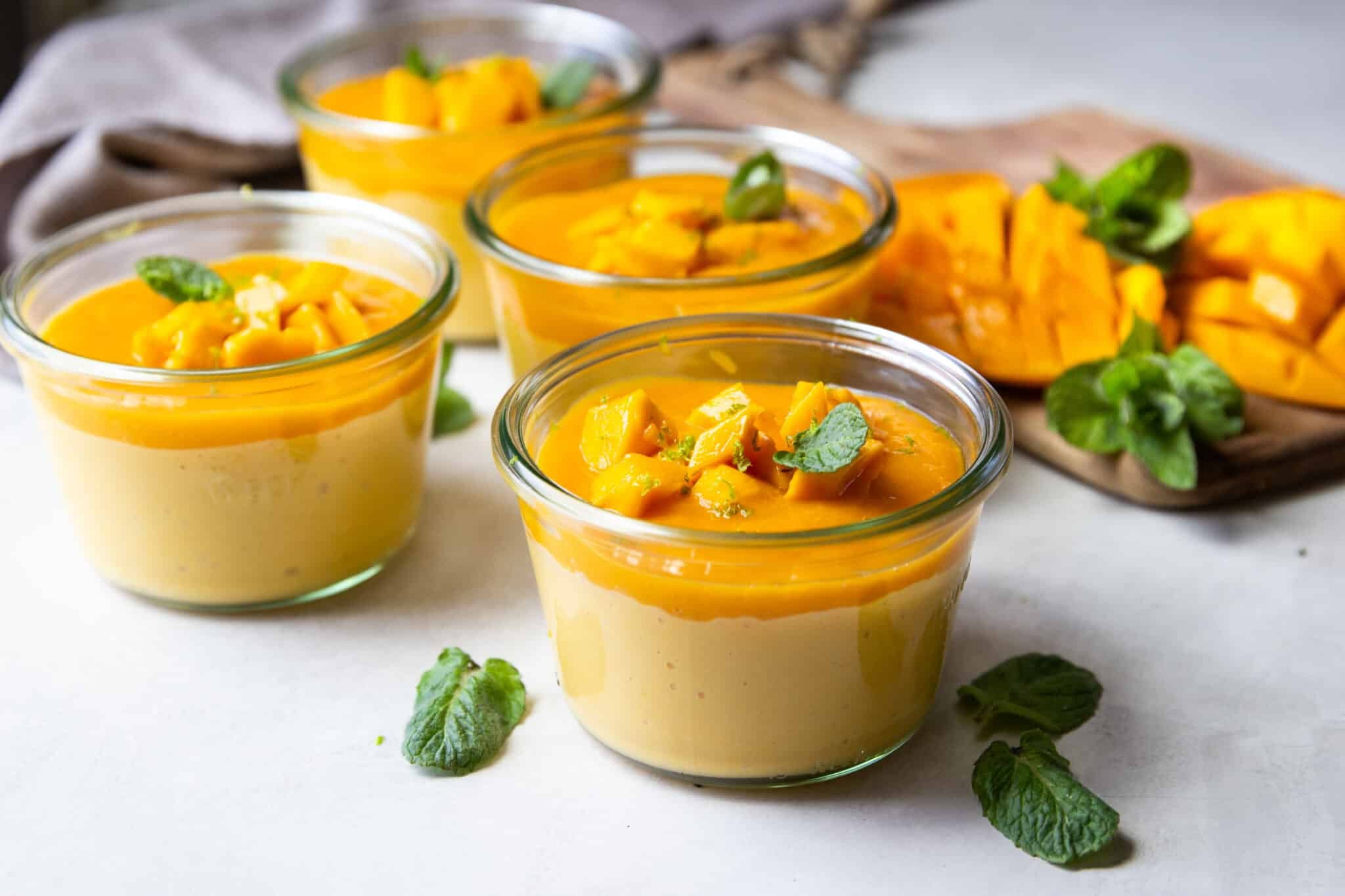 - Reserve about half of the mango purée in a separate bowl and set aside for topping.