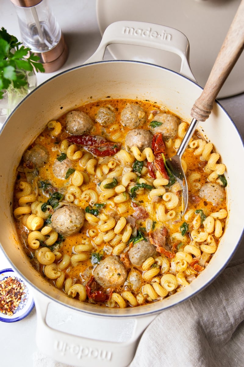 This soup is inspired by one of the most-loved recipes on my site, my Marry Me Chicken Thighs and that’s for good reason. Those creamy, sun-dried tomato flavors are just as irresistible in soup form, and this version is something I make often when I want comfort without spending all night in the kitchen. Using pre-cooked chicken meatballs keeps things simple, while the cream, parmesan, and thyme give it that same rich, cozy depth it’s known for.