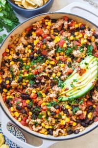 A hearty turkey taco skillet made with ground turkey, beans, corn, and spices. An easy, one-pan Mexican-inspired dinner that cooks in 20 minutes!