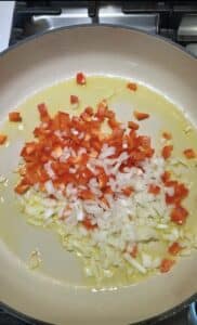 Add the onion and red bell pepper and sauté until they soften.