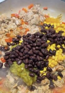 Stir in the canned ingredients. That's the fire-roasted tomatoes, black beans, corn, and green chiles. Give it a good stir.