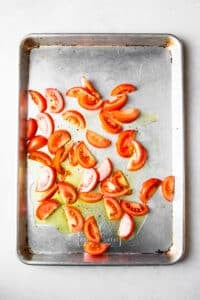 Start by slicing the fresh tomatoes into wedges and placing them on a sheet pan. Toss with 1 tbsp olive oil, salt, and pepper. Roast at 425°F for about 20 minutes, until soft, juicy, and lightly caramelized.