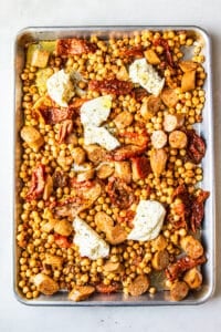 Remove the sheet pan from the oven and add the seasoned chickpeas, whole sun-dried tomatoes, sausage and cubes or slices of halloumi cheese. Spread everything out evenly.